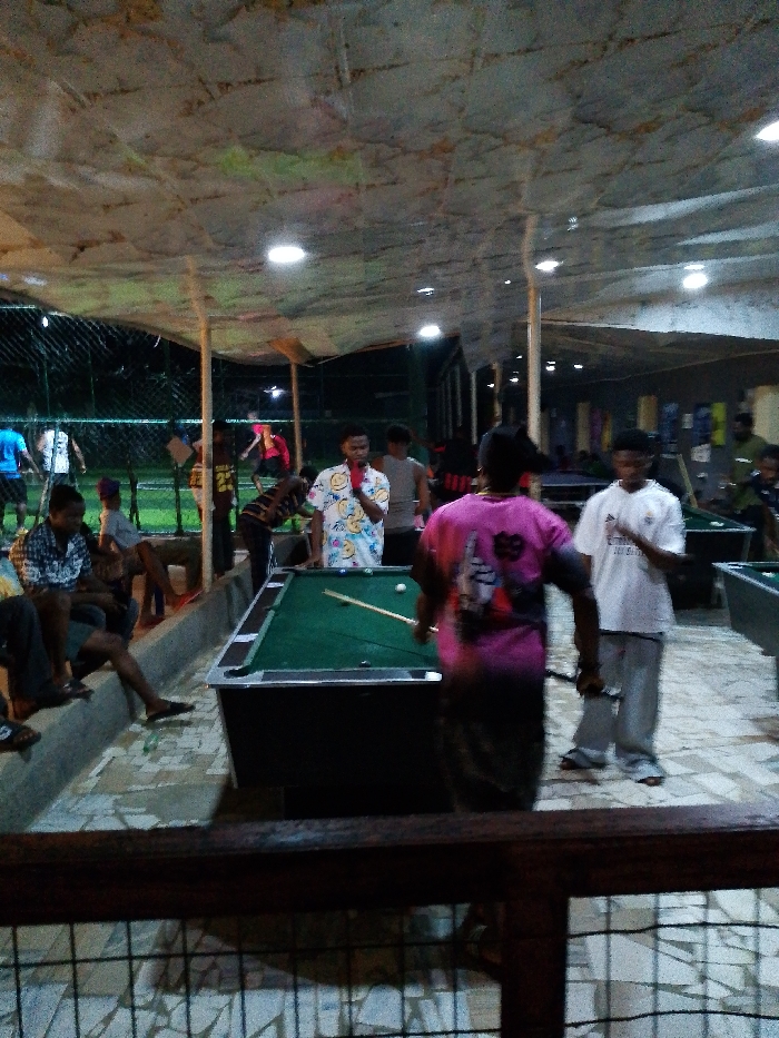 Under a makeshift, illuminated roof, several people are engaged in activities. Some sit along a concrete ledge, others stand around a billiards table. One man prepares to strike the cue ball. Several other billiard tables are visible. A fence separates the area from a grassy field where more people are gathered. A partial wooden railing is in the foreground.