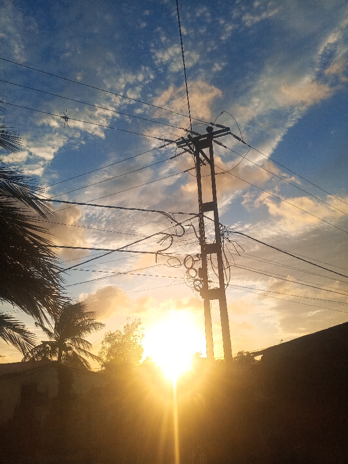 A telephone pole stands silhouetted against a bright setting sun. Multiple wires connect to the pole, stretching across a sky filled with blue and white clouds tinged with the golden light. Palm trees peek in from the left, while a darker silhouette of foliage and structures frames the right side. The intense sunlight creates a lens flare effect, obscuring details at the horizon.