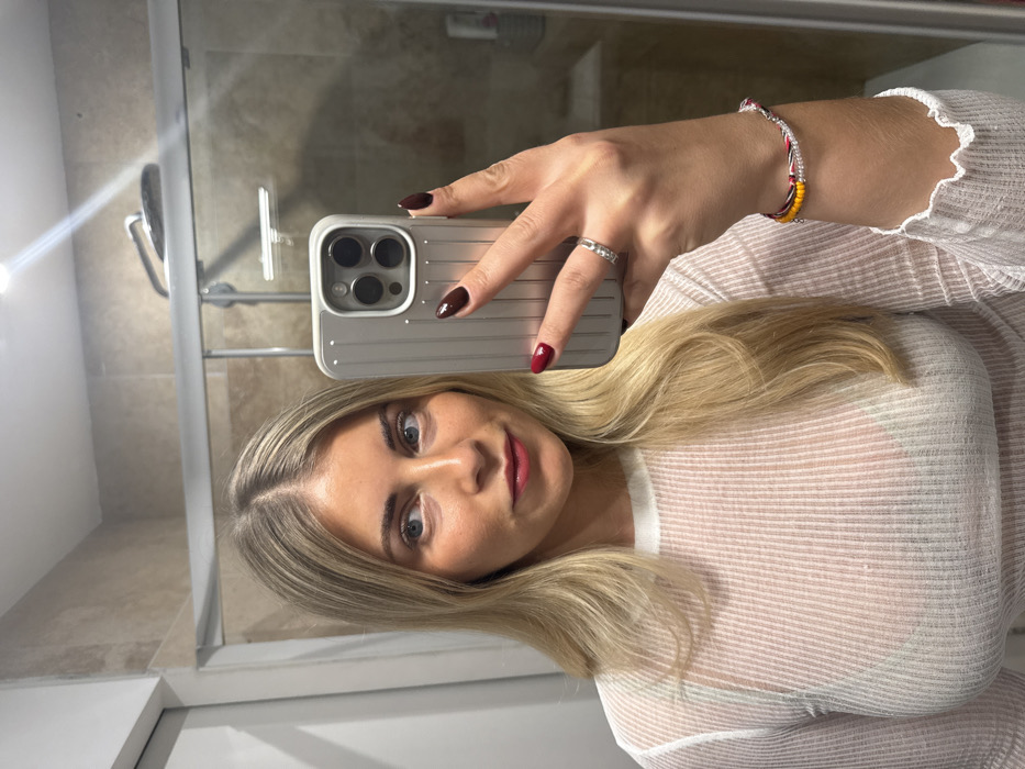A young woman takes a mirror selfie in a bathroom. She holds her iPhone in her right hand, showing off a silver-toned case and dark red manicure. The woman's blonde hair falls around her face and shoulders. She wears a white, sheer, ribbed long-sleeved shirt. A silver ring adorns her ring finger and colorful beaded bracelets are on her wrist. The background is a bathroom, featuring a showerhead visible in the mirror's reflection.