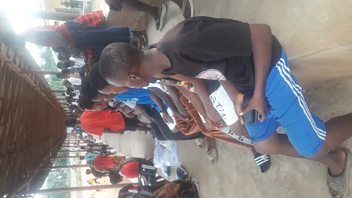 A large group of people, mostly young men, are seated in a row under a covered structure, possibly a school or community hall. They are all leaning forward, appearing focused on something in front of them, perhaps taking notes or reading. The clothing is casual, with t-shirts, shorts, and sandals. The setting seems to be outdoors, indicated by natural lighting and glimpses of trees in the background.