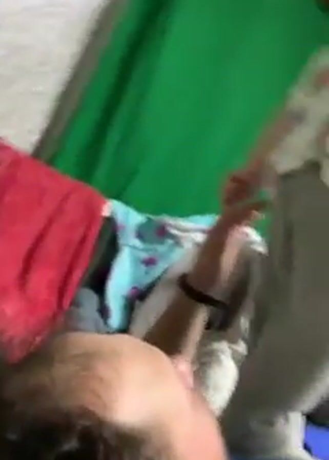 A toddler stands on a man's chest. The man is lying on his back wearing a blue shirt. The toddler is wearing a patterned white shirt and grey pants. The man holds the toddler's hands for balance. There is a green screen in the background. Another person in black pants is holding the toddler's hips.