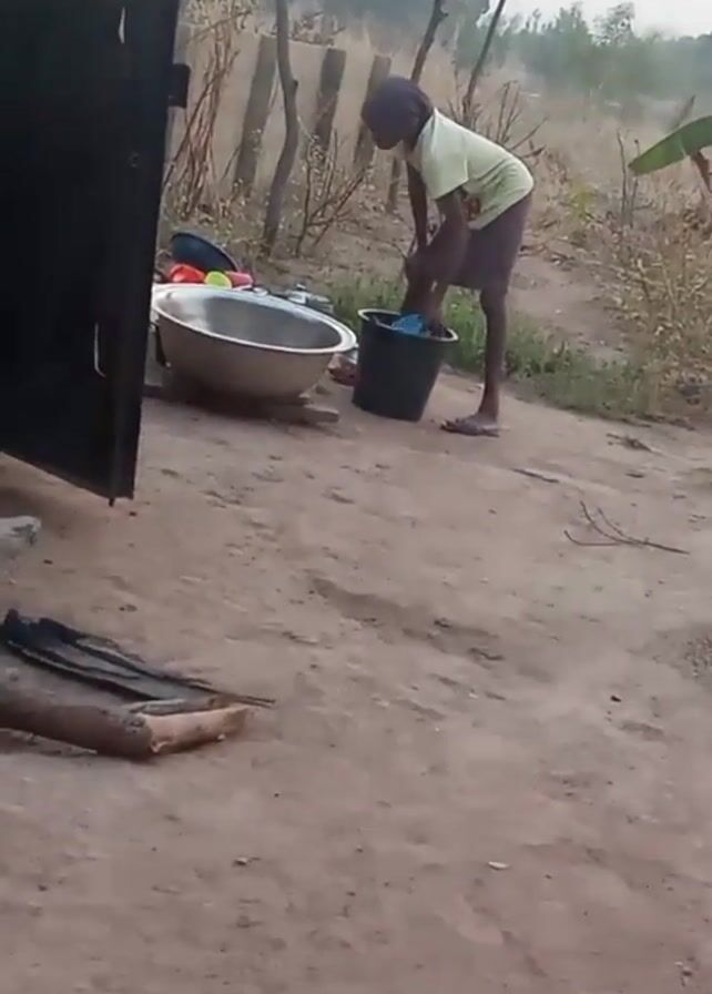 A person wearing a light green shirt and dark shorts, possibly a child, is washing something in a black bucket outdoors