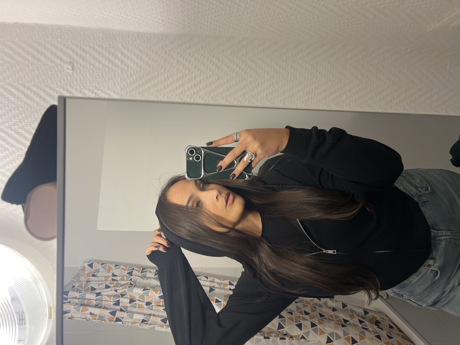 A young adult female is depicted in a mirror selfie within an indoor setting in Paris, France. She has long, dark brown hair and is wearing a black zippered, cropped hoodie over a black t-shirt and light-wash blue jeans. Her fingernails are painted a dark color, and she wears multiple silver-toned rings on her left hand. She holds a dark green smartphone, encased in a distinctive silver-toned frame, in her left hand, angling it to capture the reflection. Her right hand is positioned on the hood of her sweatshirt. The background, visible as a reflection in the mirror, includes a shower curtain with a geometric pattern (triangles in orange, blue, black, and white) on the left. To the right, a white wall with a subtle textured pattern is visible. Above the mirror, a circular white ceiling light fixture and two objects—a small, light-colored oval object and a larger, dark object—are situated on a shelf.