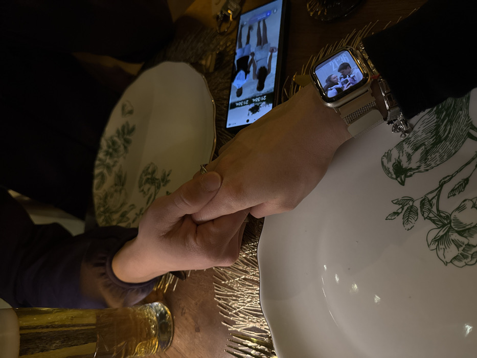 The image depicts a tabletop scene in Căciulați, Romania, illuminated by warm artificial light. Two hands are clasped together in the central left portion of the frame. The upper hand displays a ring with a clear stone on the left ring finger and a silver-toned Apple Watch with a Milanese loop band on the wrist; the smartwatch screen shows an image of two individuals. The lower hand is partially obscured by the upper hand. A dark-colored sleeve is visible on the arm of the individual whose hand is positioned below. The table surface is dark wood. Two white, scalloped-edge plates with gold rims are present, each resting on a gold-textured placemat. The foreground plate is decorated with a green illustration of a bird on a branch. The background plate features a green floral or foliage pattern. A tall, clear glass containing an amber liquid, likely beer, is situated on the far left. Metallic cutlery is partially visible to the left. A black smartphone is positioned on the table to the right of the clasped hands, its screen illuminated to display an image of four standing individuals, with time stamps "21:36" and "21:35" partially visible at the top of the display.