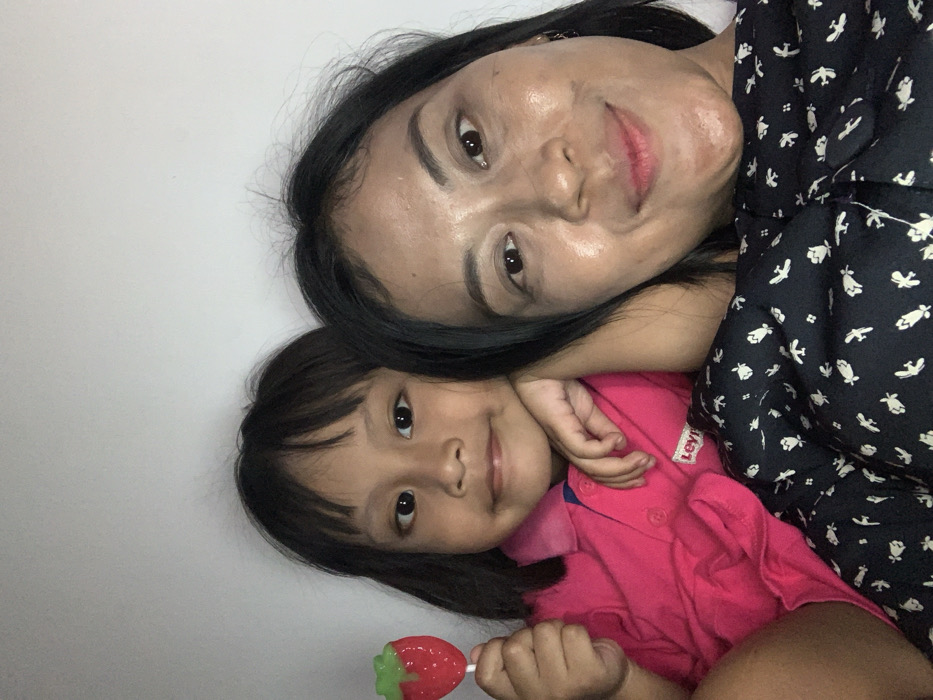 A woman and a young child pose closely together, likely for a selfie. The woman, with dark hair, wears a dark patterned dress. The child, wearing a pink shirt, holds a strawberry-shaped lollipop. Both look directly at the camera with slight smiles. The background is a plain light-colored wall, suggesting an indoor setting.