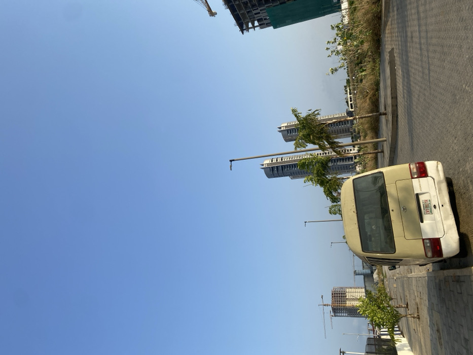 This image captures a scene in Inupa Kekere, Nigeria, under a clear blue sky with extensive urban development. A beige and white Daewoo Coaster minibus, bearing Nigerian license plate LAGOS EVY-991 YH and exhibiting rear bumper damage, is parked facing away from the viewer on a patterned paver roadway, partially on a raised curb. Young green trees line the left side of the road on a sidewalk. Tall, dark streetlights are spaced along the pavement. Beyond the vehicle, two prominent, modern, grey high-rise towers with angular architectural features stand. A row of palm trees extends to the right of the parked vehicle. Further in the background, active construction sites are visible; to the left, a multi-story building frame with an adjacent yellow tower crane is present, and to the right, another multi-story structure under construction is partially covered with green scaffolding netting, also accompanied by a yellow tower crane. The areas beyond the immediate road contain dry, sparse vegetation. No individuals are present in the scene.