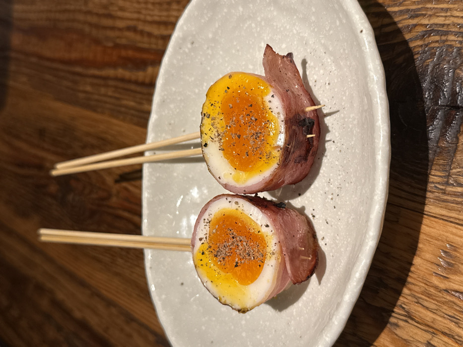 - "Two bacon-wrapped soft-boiled eggs are presented on a light-colored, irregularly shaped ceramic plate" by FM-RAq1Q2, licensed under CC BY 4.0