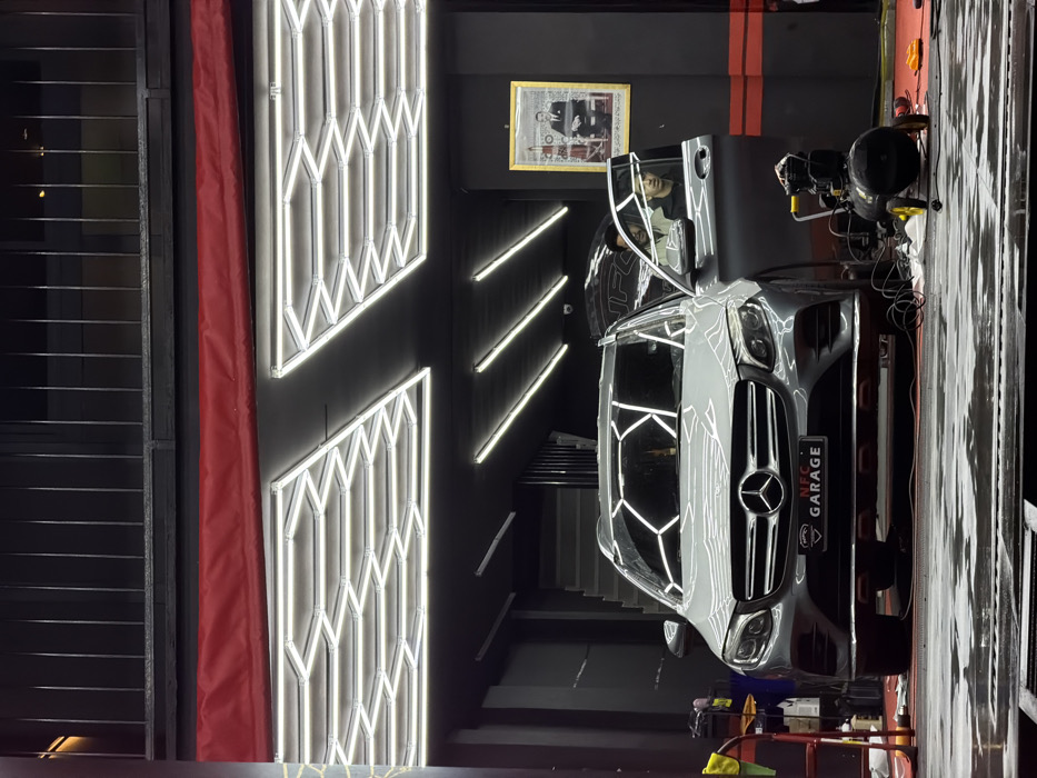The image depicts the interior of NFC GARAGE, an automotive detailing and service facility located in Meknes, Morocco. The environment features dark grey walls and ceiling, illuminated by multiple bright LED light fixtures arranged in geometric hexagonal patterns and linear strips. The floor in the foreground is wet with standing water and reflections, indicating a wash bay or detailing area, with a visible drain grate. A grey Mercedes-Benz GLC SUV is positioned centrally, facing slightly towards the right. The front driver's side door of the vehicle is open. A male individual with dark hair is seated in the driver's seat, looking forward. Another individual is partially visible behind the driver. The vehicle's front grille prominently displays the Mercedes-Benz logo, and a temporary plate or sign reading "NFC GARAGE" is affixed below it. To the right of the vehicle, a yellow and black air compressor on wheels is situated on the wet floor, with coiled hoses nearby. On the far left, partially obscured, are cleaning supplies on a yellow cart. A framed portrait, likely of King Mohammed VI of Morocco, with a gold frame, hangs on the right-hand wall. A horizontal red fabric strip or awning runs across the upper part of the image, beneath a dark upper level with vertical metal railings. A dark staircase with light-colored steps is visible in the background on the left. A small black security camera is mounted on the ceiling.