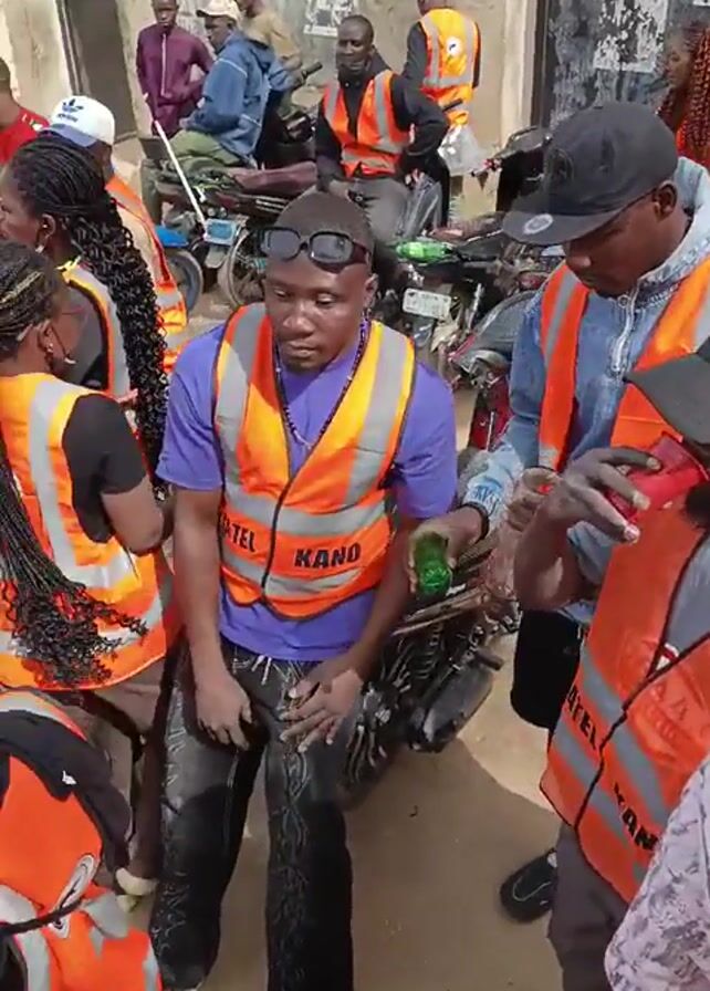 group of people, mostly adults, gathered outdoors in what appears to be a public area. Many are wearing bright orange safety vests with "KANO" printed on them, suggesting they might be workers or volunteers. Some are drinking from red plastic cups, while others are equipped with brooms. Several motorcycles are parked nearby. In the background, there are cars, buildings, a fence, and some greenery. The people are moving around and talking, creating a lively atmosphere. The video appears to be handheld, as there are some slight movements and shifts in perspective.