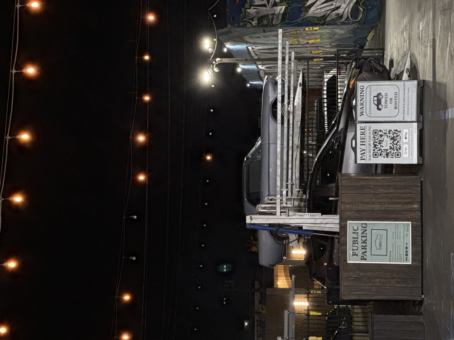 parking area at night, illuminated by string lights. A sign reads "Public Parking" with a "SafetyPark" logo. Adjacent, a "Pay Here" sign encourages QR code scanning for payment. A warning sign threatens towing or booting for unauthorized vehicles, citing a service fee. A car is parked nearby, partially obscured by a metal structure. Graffiti is visible on a wall in the background. The scene suggests a monitored parking facility with automated payment options and strict enforcement.