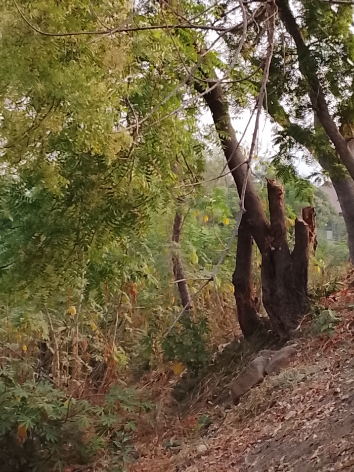 The image displays an outdoor, vegetated environment within Zango-ndaji, Nigeria. The foreground on the right exhibits an earthen slope covered with dry, brown fallen leaves and scattered grey stones. In the mid-ground, a prominent dark brown tree structure is visible, consistent with a multi-stemmed tree stump or a heavily pruned tree, featuring irregular trunks. One substantial trunk section appears to have a jagged, horizontal severance or break. To the left and extending into the background, dense foliage predominates, composed of various trees and shrubs with green leaves, interspersed with drier, light brown undergrowth. Tree branches are discernible against a diffused, light-colored sky in the upper portion of the frame. No human subjects, animals, vehicles, or definitive man-made structures are present within the depicted scene.