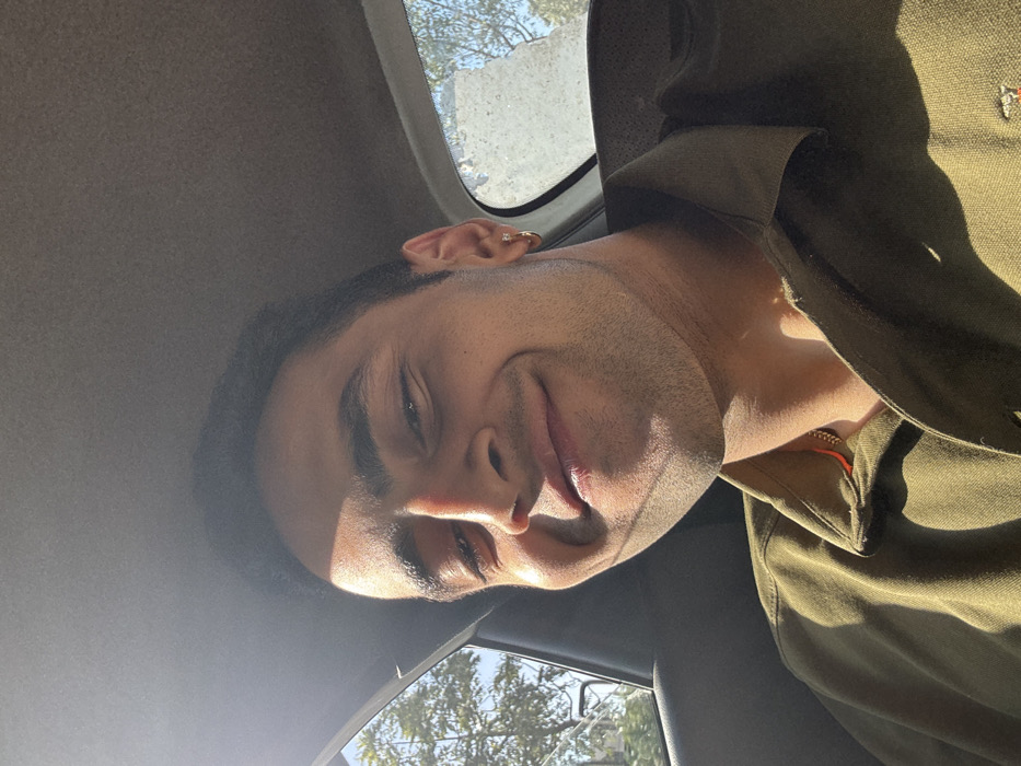 The image depicts a male individual, appearing to be in his 20s-30s, seated within a vehicle, consistent with the city of Jaipur Municipal Corporation, India. The subject has short dark hair and a light to medium skin tone, looking directly at the camera with a broad smile, partially closed eyes, and slightly puffed cheeks. He is wearing an olive green or dark khaki collared shirt, unbuttoned at the top, revealing a thin gold-colored chain with a small orange detail around his neck. A small gold hoop earring is visible in his left earlobe, and a small, clear stud earring is in his right earlobe. Strong natural light illuminates the right side of his face (viewer's left), casting distinct shadow patterns. The interior of the vehicle includes a light-colored headliner visible in the upper portion of the frame. Through the vehicle's windows, blurred green foliage and a clear blue sky are discernible, indicating an outdoor, daytime setting. No other individuals or specific identifying landmarks are present within the frame.