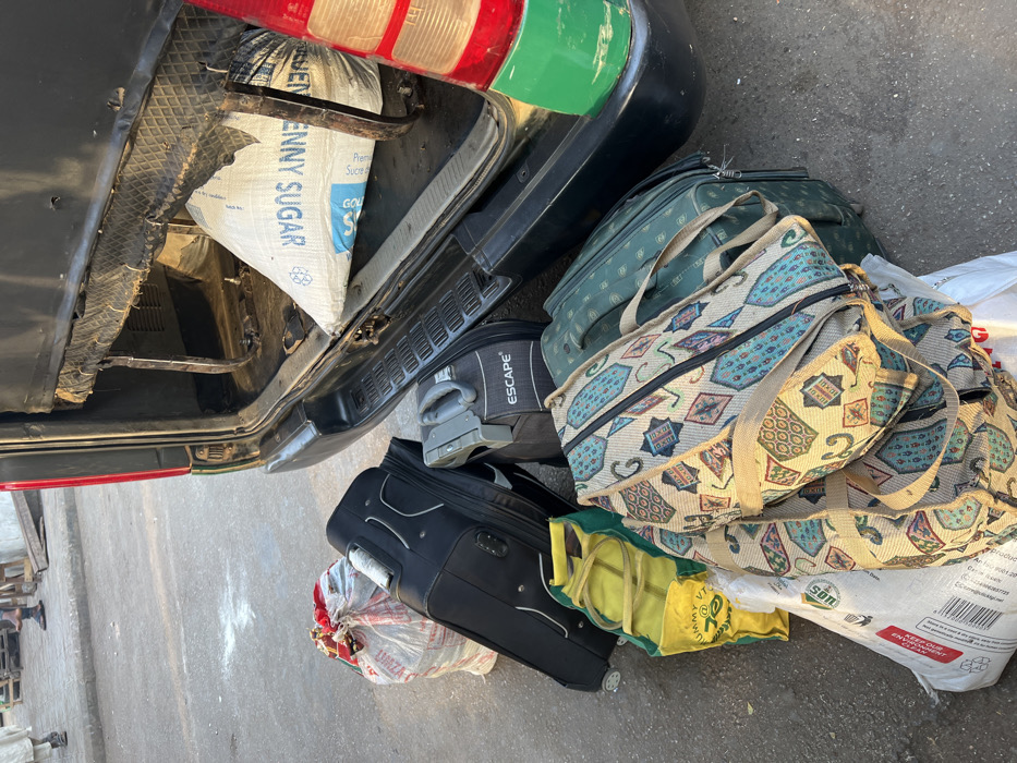 The image depicts a street scene in Ado, Nigeria, focusing on the rear of a dark-colored vehicle, likely a minivan or SUV, with its hatch open. The vehicle's cargo area is exposed, showing a worn, black floor, damaged interior paneling, and visible metal seat frame supports. A large white sack, inverted and partially torn, labeled "PENNY SUGAR" is visible within the cargo space. On the dirty, paved ground directly behind the vehicle, a collection of luggage and sacks is piled. This includes a black rolling suitcase, a smaller black soft-sided bag labeled "ESCAPE," a green rolling suitcase, and several soft-sided fabric travel bags. One prominent fabric bag features a distinct geometric pattern in shades of blue, brown, and cream. Also present are multiple large white industrial-style sacks, one with red text and a barcode, and a yellow and green fabric bag. The scene is illuminated by natural light, casting subtle shadows. In the blurred background, indistinct figures and the lower portions of structures or stalls suggest a busy urban environment.