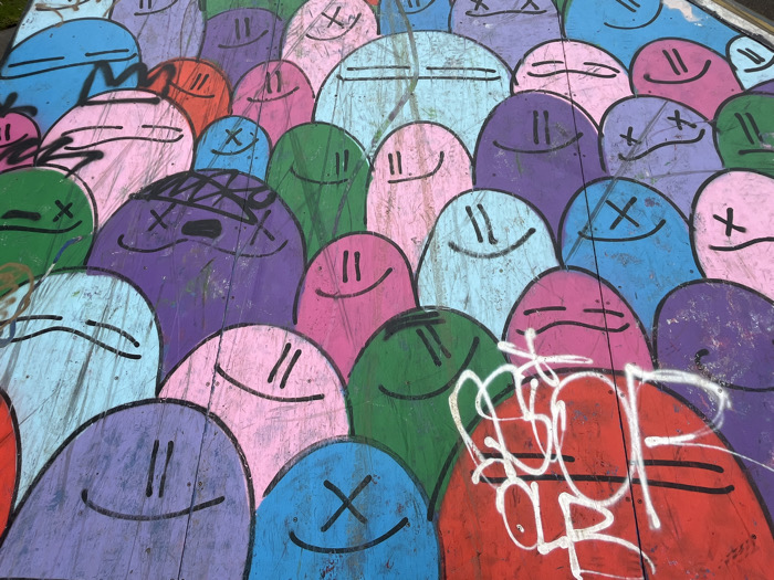 The image depicts a close-up view of a heavily graffitied wooden surface, located in Longeville-lès-Metz, France. The surface is constructed from vertical wooden planks, showing distinct seams, scratches, and scuff marks indicative of significant wear and outdoor exposure, consistent with a skate ramp. The primary artwork consists of a dense, multi-colored mural featuring numerous overlapping, cartoon-style, rounded, blob-like figures. These figures are rendered in various colors including light blue, pink, purple, green, orange, and red. Each figure displays a minimalist facial expression: most have eyes depicted as simple horizontal lines, two short parallel vertical lines, or "X" marks. Mouths are typically curved lines, suggesting smiles. A prominent purple figure near the image center exhibits "X" eyes, a curved mouth, and a crosshatch pattern on its upper head. Another light blue figure in the upper-center displays elongated parallel horizontal lines for eyes. Overlaid upon this mural, particularly on a red figure in the lower right quadrant, is additional white spray-paint graffiti in a distinct tagging style, partially obscuring the original artwork. The painted surfaces show signs of abrasion and slight fading due to environmental factors and use. No individuals are present in the frame, and no dynamic actions or interactions are depicted; the scene is static.
