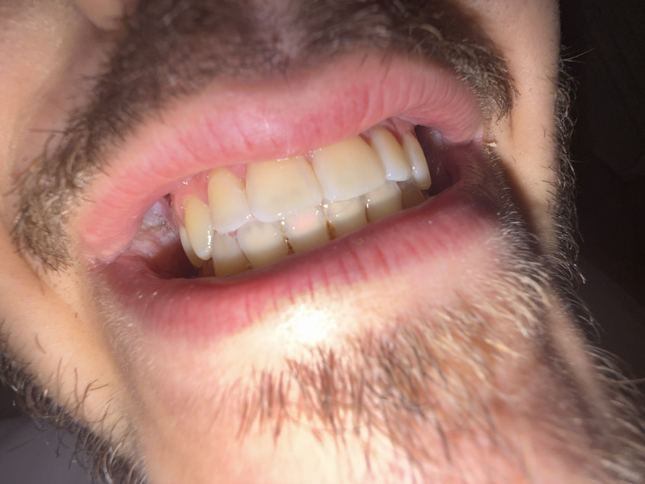 This image presents a close-up, angled view of a person's open mouth, situated in the city of Unknown, Unknown. The subject is an individual, implied to be male due to the presence of dark brown facial hair growing along the lower jawline and chin, extending upwards towards the cheek. The mouth is open, with the lower left lip and cheek visibly retracted, exposing the lower left mandibular dentition. Approximately seven teeth are visible, ranging from premolars to molars. These teeth display an off-white to light yellow coloration, with distinct yellowish-brown extrinsic staining present along the gingival margins and in the interproximal spaces of several teeth. The gingiva (gums) appears pink and healthy. The internal oral mucosa of the lower lip and cheek is visible, appearing moist and reddish-pink. The background of the image is dark and out of focus, suggesting an indoor environment with focused illumination on the subject's mouth.