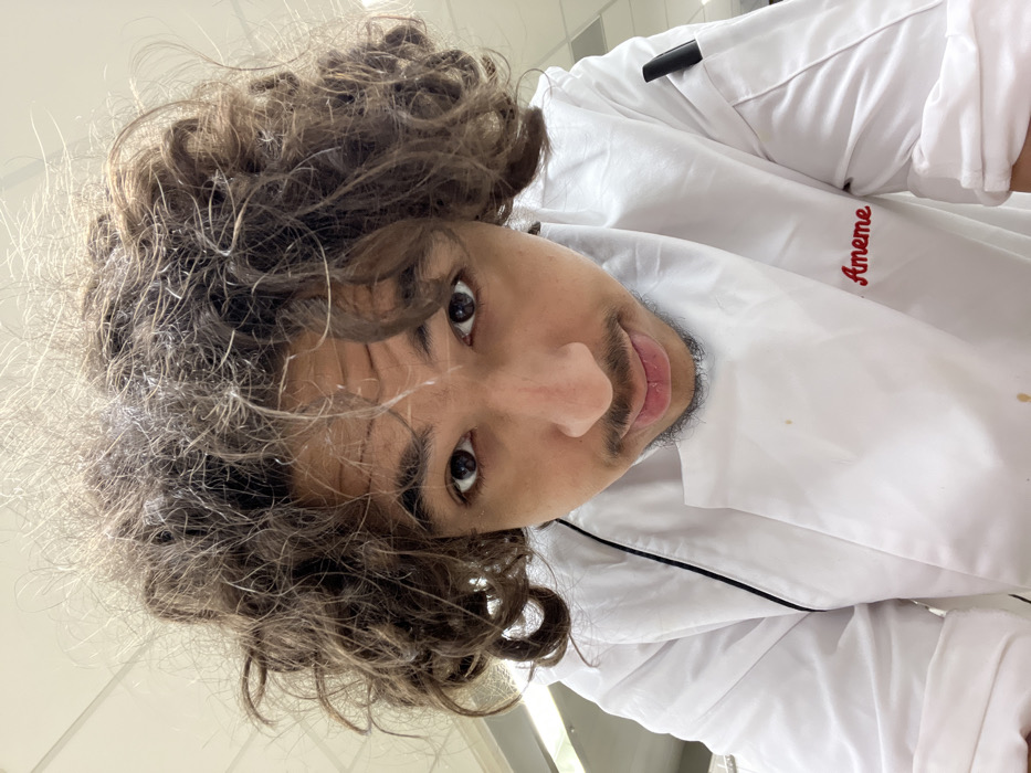 A person with curly, voluminous brown hair fills the frame, slightly turned to the left. They have dark eyes, a mustache, and a hint of a beard. The person is wearing a white chef's coat with the name "Ameme" embroidered in red on the upper right sleeve. The background appears to be a tiled wall, with a window subtly visible in the lower right corner. The photo is angled, giving a slightly tilted perspective.