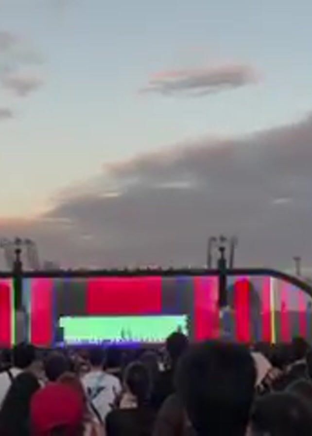 A large crowd of people is gathered at an outdoor concert at dusk. A large stage with screens is visible in the distance. The screens show a performer singing and playing an instrument, possibly a piano or keyboard. The sky is cloudy with a pink hue near the horizon. Lighting towers are on either side of the stage. The crowd is facing the stage and appears to be enjoying the performance.