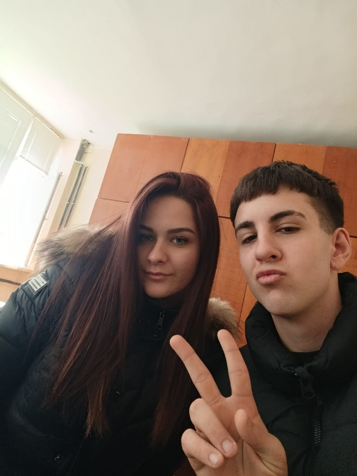 This indoor photograph captures two young individuals, a female and a male, in a close-up, chest-up orientation. The female, positioned on the left, has long, dark reddish-brown hair and is wearing a dark, possibly black, winter jacket with a light-colored fur trim on the hood. A white insignia is visible on her left upper arm. She looks directly at the camera with a neutral expression. The male, positioned on the right, has short, dark hair styled in a bowl cut and is also wearing a dark, possibly black, winter jacket. He puckers his lips and extends his right hand into the foreground, forming a two-finger "peace" gesture, while looking directly at the camera. The background indicates an interior setting, identified as an indoor location within Kavarna, Bulgaria, consistent with a classroom or institutional building. To the left, a window fitted with white horizontal Venetian blinds is visible, below which a light-colored radiator is mounted. The wall behind and to the right of the subjects is composed of vertically oriented, light brown wooden panels. The ceiling is plain white.