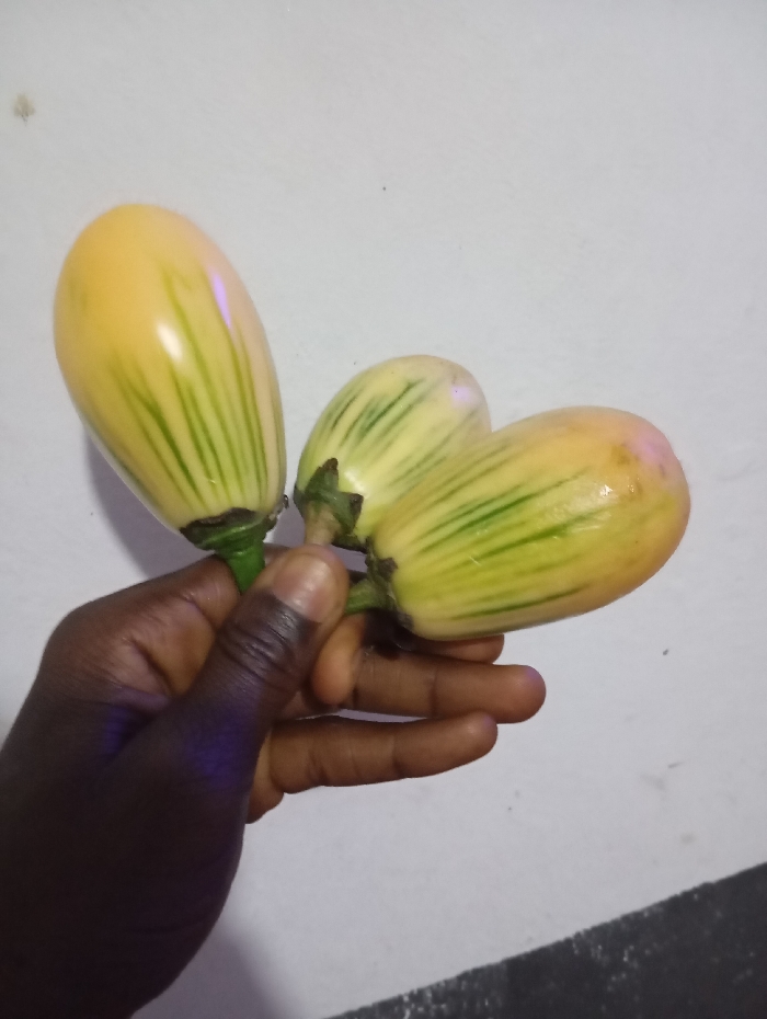 A hand holds three African eggplants. The eggplants are oval-shaped with a yellow and white striped skin. Green lines run vertically along the surface. The stems are a dark green. The background is a plain white wall. The hand holding the eggplants is dark-skinned.