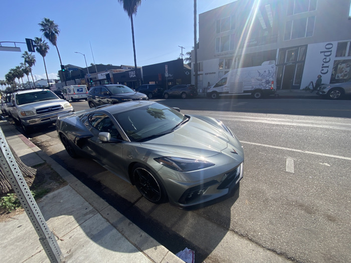 A gray Corvette C8 is parked on a sunlit street next to a white pickup truck. The street includes palm trees and various commercial buildings like a "Credo" store and a cafe. Other vehicles, including an SUV, a van, and a smaller car, are visible further down the street. A metal pole stands near the foreground of the image.