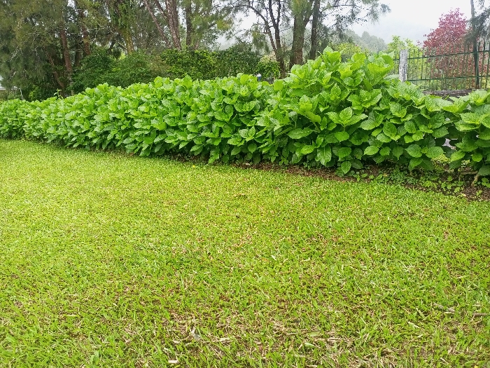 A vibrant green lawn stretches out, bordered by a lush, leafy hedge. The hedge is neatly aligned, comprised of individual bushes that blend together. In the background are taller trees and shrubs, adding depth to the landscape. A section of fencing is partially visible behind the hedge on the right. The scene suggests a well-maintained garden or park on a slightly overcast day.