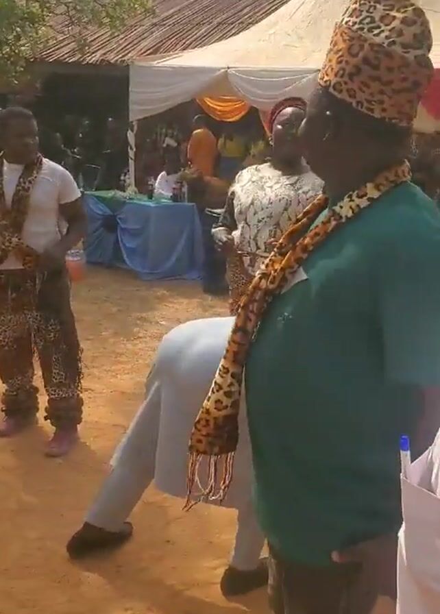 The video captures a lively event, potentially a celebration or gathering, taking place outdoors under a large tent. The scene is filled with people dressed in colorful attire. The man in the center is dressed in a green shirt and a hat and scarf, both with a leopard print. There is a man behind him bending over. Another man is dressed in a white t-shirt and animal print pants. In the background, many people are seated under the tent. The ground is dirt. The audio has music and talking.