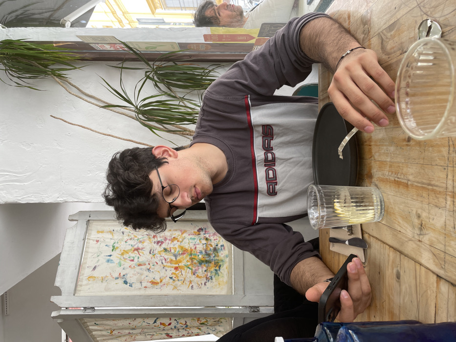 A young man wearing a grey Adidas sweatshirt is sitting at a wooden table in a restaurant. He is looking down at a smartphone in his right hand, and his left hand is resting on the table. A glass of water is in front of him, along with a black plate and a knife. There is a person's reflection visible through a window behind him. The restaurant is decorated with a colorful patterned screen behind him and a potted plant to his right. The restaurant appears to be located in Seville, Spain, with coordinates 37.398, -5.988. The image shows a moment of solitude as the young man focuses on his phone, potentially in the middle of a conversation or browsing online. The warm lighting and the casual setting suggest a relaxed environment. The environment in the image appears to be an indoor cafe.