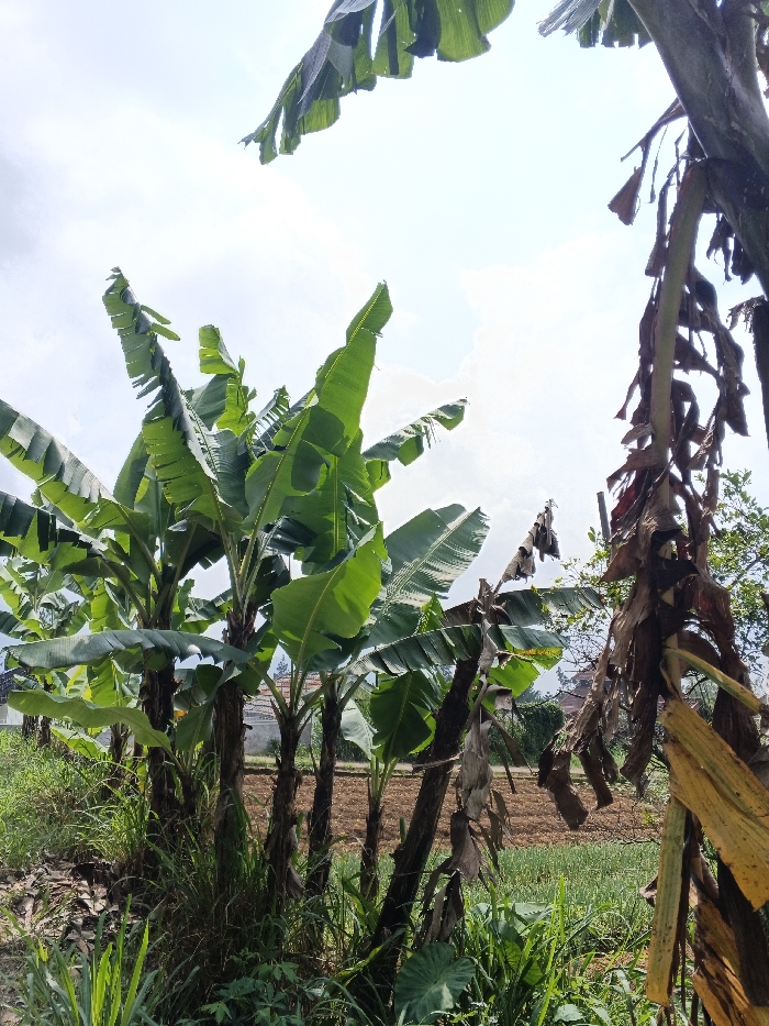 The image displays an agricultural landscape located in Ea Tê, Vietnam. The scene is dominated by a cluster of banana plants with prominent large, green leaves on the left and center. To the right, banana plant stalks are visible, covered with numerous brown, dried, and decaying leaves. The immediate foreground features dense green grass and various other low-lying foliage. In the midground, a field of tilled brown soil is present, adjacent to another field cultivated with low-lying green crops. Distant structures, appearing as white-walled buildings with visible rooflines, are partially obscured by vegetation on the horizon. The sky is bright with scattered white cloud formations. No individuals or active interactions are observed within the frame.