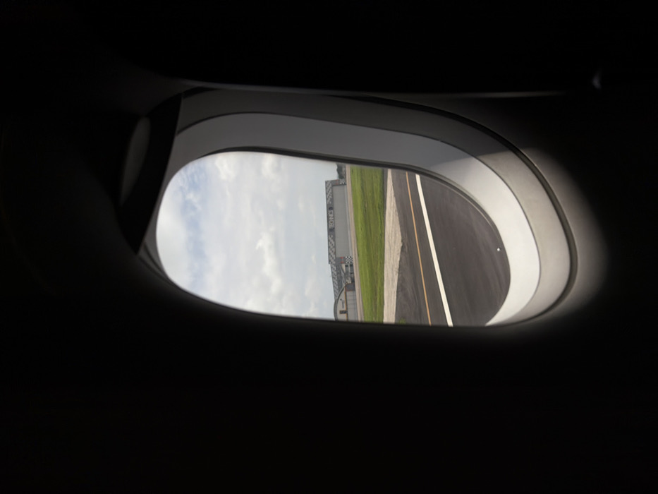 view from inside an aircraft through a window. Outside the window, there is a racetrack with a building in the background. The building is white with black and white checkered sections. There is a strip of green grass adjacent to the racetrack. The sky is visible above the building, with some clouds. The airplane window frame is visible in the foreground, with a dark, shadowy interior.