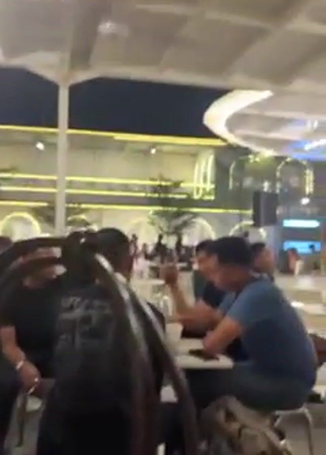 casual outdoor dining area, possibly a cafe or restaurant, at night. Many people are sitting at tables, some engaged in conversations, others looking at their phones. The area is well-lit with overhead lighting and decorative elements. A person with a dark bag walks past the camera at the start. The camera moves through the space, showing different groups of people and the overall atmosphere.