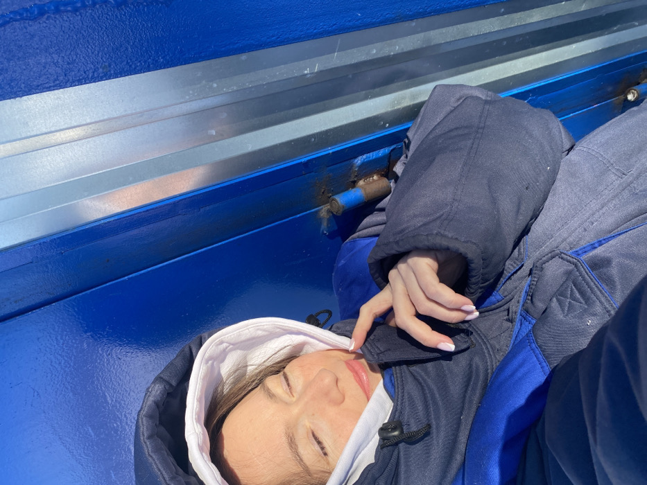 In Ol'khovskoye, Russia, a female individual is depicted in an outdoor environment, positioned against a bright blue metal surface. She is seen from the chest up, wearing a dark blue winter jacket with a lighter blue panel on the upper arm, over a white hooded sweatshirt with the hood pulled over her head. Her eyes are closed, and her head is tilted slightly upward, with direct sunlight illuminating her face. Her left hand, featuring manicured nails with white tips, is gently placed near her chin. The background consists of a smooth, glossy blue painted metal surface occupying the left and central portions of the frame. To the right, a vertical section of corrugated galvanized metal is visible. A dark, rusted metal fixture, partially painted blue, is affixed to the blue surface, positioned beneath the corrugated metal section.
