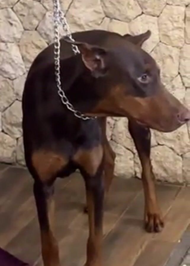 A person pets a Doberman. The dog is brown and tan with cropped ears, and is wearing a silver chain leash. The person petting the dog wears a white top. The person holding the leash wears a black top, and a maroon sneaker with black stripes. The background features a light brown stone wall, and brown wood flooring.