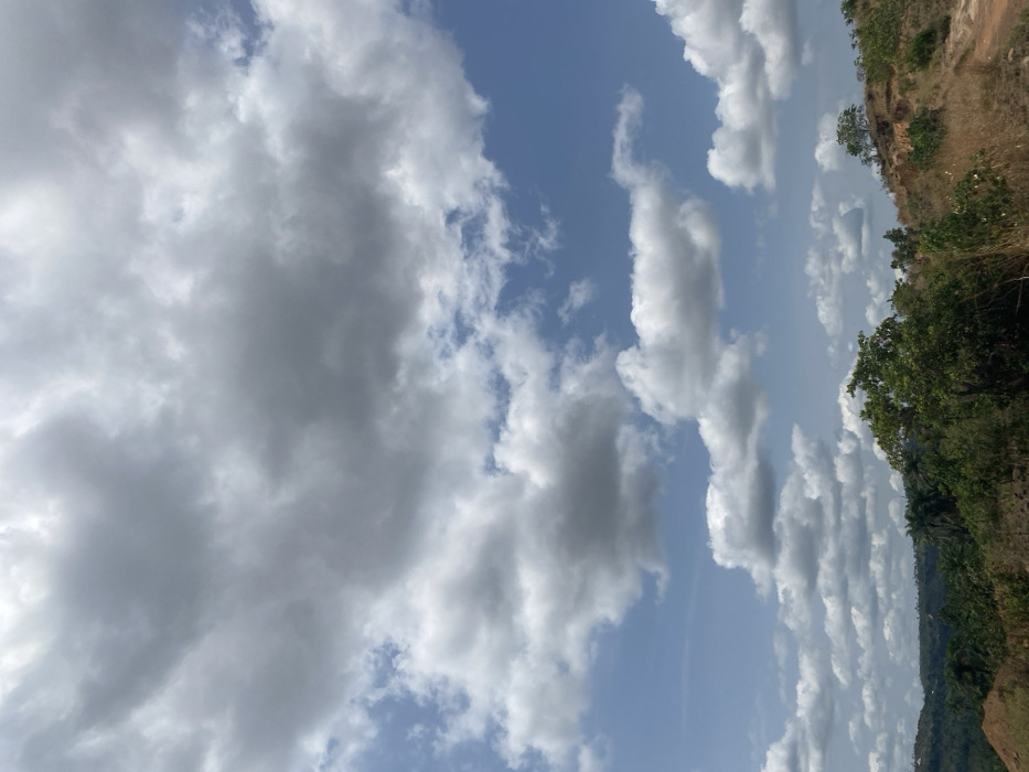 The image displays an outdoor panoramic landscape in Ufueseni, Nigeria, under a partly cloudy daytime sky. The upper two-thirds of the frame are dominated by a blue sky interspersed with numerous cumulus clouds of varying sizes and densities, ranging from bright white to shades of grey. The lower third of the image features a hilly terrain. In the foreground to the right, a reddish-brown hillside is visible, characterized by dry, sparse vegetation and exposed earth. Towards the left and center midground, a cluster of lush green trees with dense foliage stands out. The background shows undulating hills covered with a mix of green and drier vegetation extending into the distance. No human figures, animals, or significant man-made structures are prominently visible.