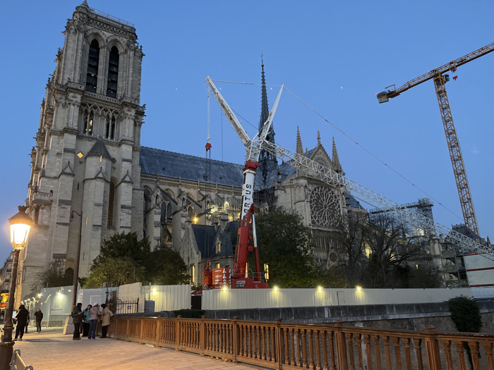 Notre Dame Cathedral in Paris stands as a prominent architectural landmark, partially obscured by ongoing restoration efforts visible through scaffolding and construction barriers. Two large cranes are strategically positioned around the cathedral, suggesting active repair work. A small group of onlookers stand on a bridge, observing the scene, while a street lamp casts a warm glow on the foreground. The sky is a soft twilight hue.