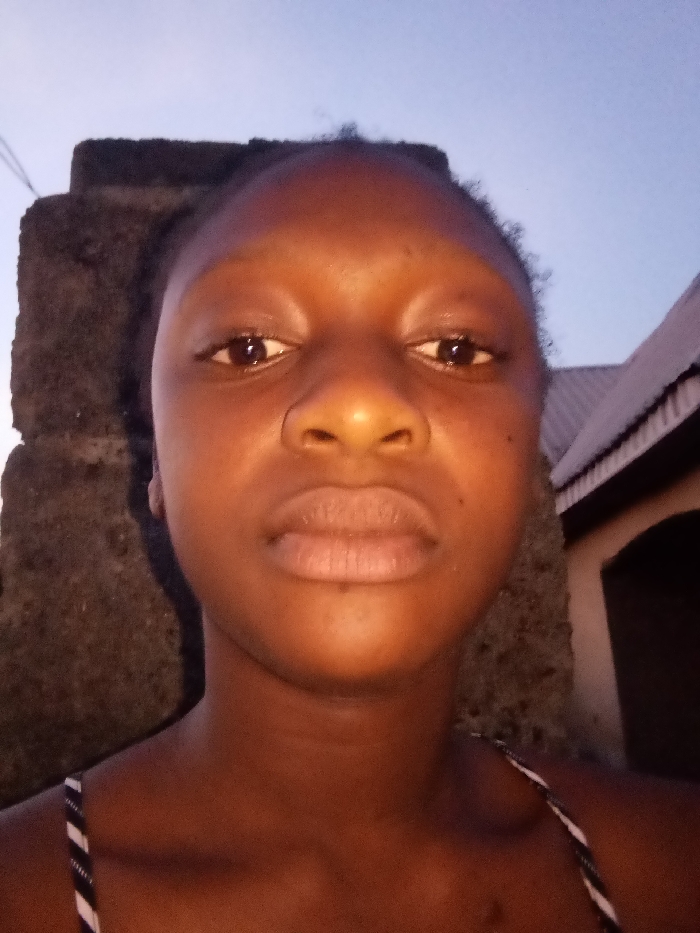 A close-up, frontal shot shows a young woman with brown skin. Her features include dark brown eyes, a wide nose, and full lips. Behind her on the left is a weathered gray structure, possibly concrete. To the right, a building is visible, with a dark archway and a sloped roof. The sky overhead is light blue, suggesting dusk or dawn. The woman wears a striped top.
