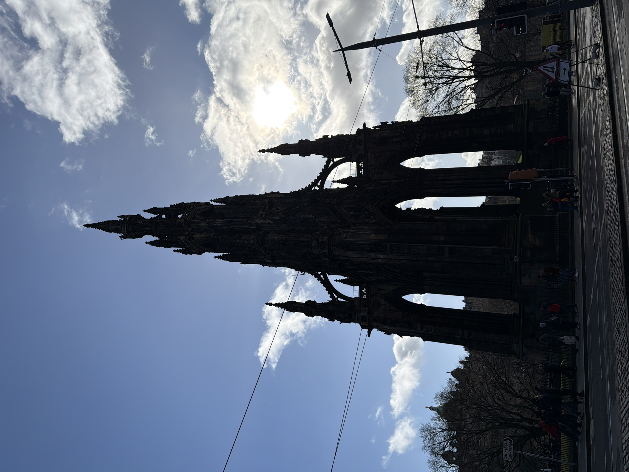 A low-angle, backlit vertical photograph captures the Scott Monument in the City of Edinburgh, United Kingdom, silhouetted against a partly cloudy blue sky. The monument's dark Gothic spires and arched structural elements dominate the central frame. A bright sunburst is visible in the upper right, partially obscured by white cumulus clouds. Multiple thin, dark overhead wires traverse the sky horizontally. In the foreground, a paved street with visible road markings and parallel lines, indicative of tram tracks, runs horizontally across the bottom of the image. A sidewalk separates the street from the monument's base. Approximately fifteen to twenty individuals are visible on the sidewalk, walking or standing, their features largely obscured by shadow. Street infrastructure includes two traffic light poles, one displaying a red light on the right, and a tall streetlamp pole on the far right. Road signs present include a white directional sign pointing left and stating "All other Routes" on the left, and a portable A-frame sign on the right depicting a "road narrows" warning symbol. Bare deciduous trees are situated behind the sidewalk and to the left of the monument, with the dark outlines of additional urban structures, including a domed building, faintly visible in the far background on the left.