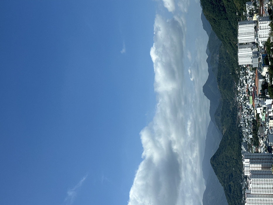 A sky view transitions from clear blue to white, billowing clouds. Jagged, green mountains descend towards a town with dense buildings. Tall, white structures mark the edge of the cityscape where it meets the mountain's base. The scene suggests a meeting of natural beauty and urban development.