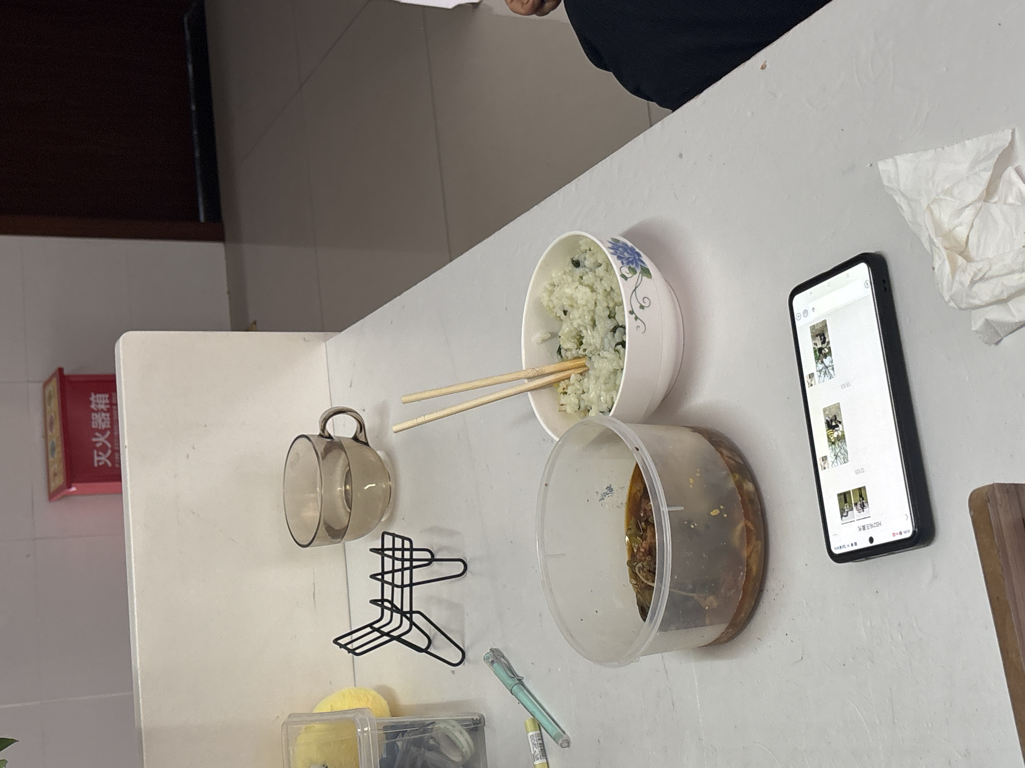 A high-angle shot depicts a partially visible person in a dark shirt at the top of the frame and a collection of items on a white surface, possibly a table or countertop. These items include a bowl of rice with chopsticks resting on top, a clear plastic container with food inside, a black smartphone displaying images on its screen, a crumpled white tissue, a transparent mug, a black dish rack, a sponge, and several other small containers and pens. A fire extinguisher box is visible on the left side of the image. The location might be in Jiangjin, China, based on details displayed on the phone screen.