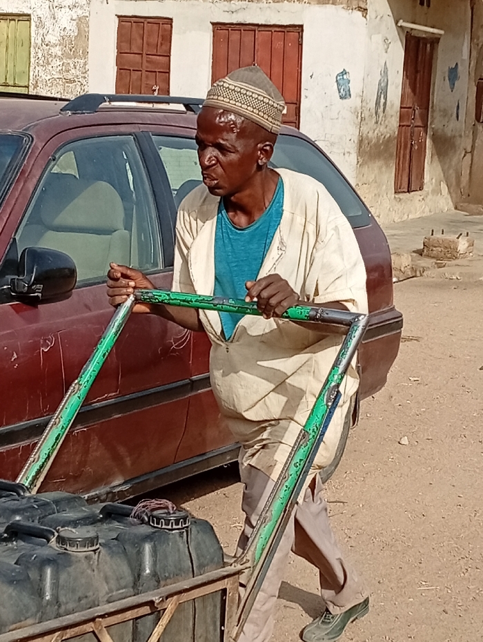 An adult male is depicted in a daytime street scene in Gayawa, Nigeria. He possesses dark skin, a shaved head covered by a light-patterned skullcap, and a visible lesion or scar on his forehead. He is wearing a light-colored tunic over a teal t-shirt, light trousers, and dark footwear. His expression is strained, mouth slightly open, as he grasps the green-painted metal handles of a two-wheeled pushcart. The cart carries at least two black plastic containers, likely jerrycans, one of which has a reddish-brown cord wrapped around its cap. Behind the man and cart, a maroon sedan with a roof rack is parked. In the background, two weathered, light-colored buildings with brown window frames and some faded markings are visible. The ground is unpaved, appearing as dry earth.