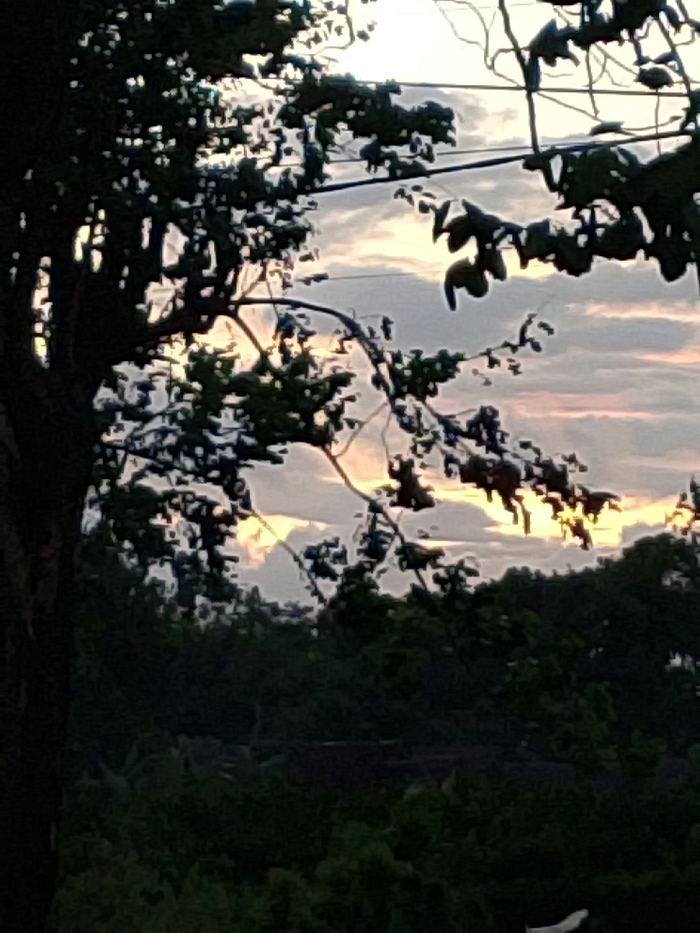 The scene depicts an outdoor environment in Gadingrejo, Indonesia, under a sky suggesting either dawn or dusk conditions. The upper portion displays a cloudy sky with varying shades of grey and white, interspersed with areas of soft yellow-orange light. A large tree trunk, dark and partially obscured, occupies the left foreground. Its branches, heavily covered with dark green foliage, extend across the upper frame, silhouetted against the sky. Multiple thin, dark utility wires are visible horizontally across the mid-upper portion of the sky, passing behind the tree branches. The lower half of the image shows a dense, dark green expanse of vegetation, indicative of trees and shrubs, extending into the background. No human subjects, animals, or specific actions or interactions are present.