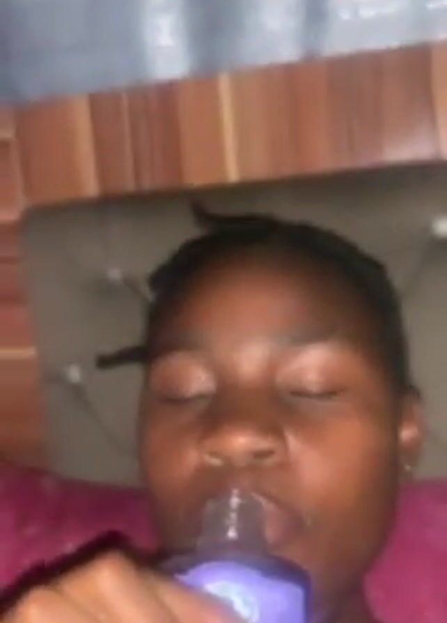 A woman is lying down, possibly in a bed, and drinking from a bottle of purple liquid