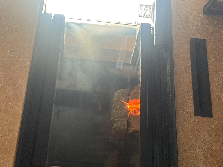 The image displays an indoor scene in Popova Shapka, North Macedonia, focusing on a functioning fireplace. The fireplace features a black metal frame around a dark-tinted glass door, behind which a fire is actively burning. Inside the firebox, approximately three split logs are stacked, with vibrant orange and yellow flames visible primarily between the lower two logs. A faint smoke or haze partially obscures the interior of the firebox. The fireplace surround is constructed from a textured, light beige or tan material. Below the glass door, a black rectangular vent or access panel is integrated into the lower section of the surround. To the immediate right of the fireplace, a strong, bright light source, consistent with natural light from a window or doorway, illuminates the area. A small, clear, patterned glass container rests on a surface to the right of the fireplace, near the bright light. No people or overt actions are depicted.