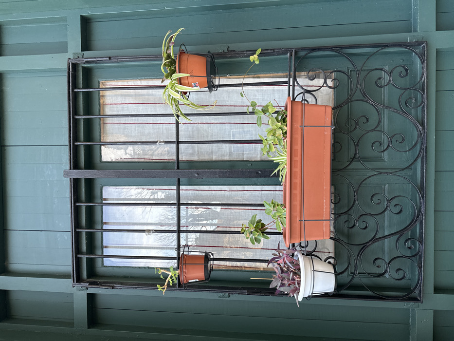 window with a black wrought iron grill and four potted plants