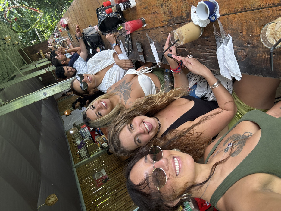 A group poses at a long wooden table. The image, taken from the end of the table, features four women in the foreground smiling and looking directly at the camera. Some sport sunglasses. Behind them, several other people sit, also looking toward the camera. Drinks, tableware, and personal items are scattered on the table. A bamboo structure and tropical foliage form the background, suggesting an outdoor setting.