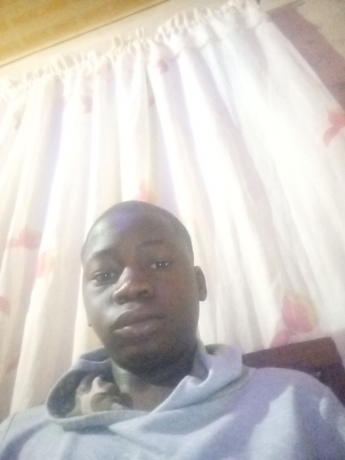 A person with dark skin, a shaved head, and wearing a gray hooded sweatshirt takes a selfie. The person looks directly at the camera with a neutral expression. The background consists of white curtains with a sparse floral print. The lighting appears soft and diffused. A portion of a dark brown wooden chair is visible to the right.