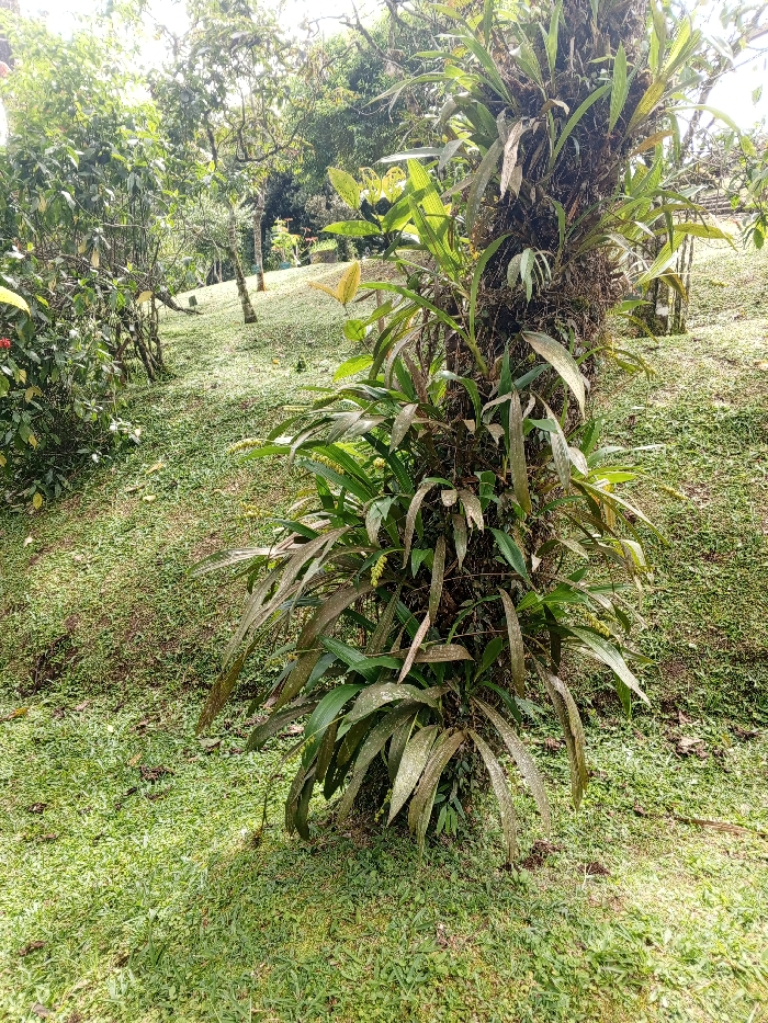 The image displays a natural, heavily vegetated outdoor scene, likely situated on the Sơn Trà Peninsula in Đà Nẵng, Vietnam. The central subject is a tree trunk, positioned slightly to the right of the frame, densely covered from base to mid-height with epiphytic plants. These plants feature numerous elongated, lanceolate green leaves, some exhibiting light brown or yellowing tips, and clusters of small, pale yellow-green buds or flowers. The trunk itself is obscured by this growth and appears textured. The ground is covered with a uniform layer of short, vibrant green grass, interspersed with minimal debris, suggesting a manicured or naturally sparse forest floor. This grassy area slopes gently upwards towards the background. In the mid-ground and background, additional trees with thick, green foliage are visible, forming a dense canopy that suggests a forest or well-established parkland. The lighting is natural and bright, indicating daytime conditions, with sunlight illuminating portions of the ground and foliage, creating areas of highlight and shadow. No individuals, man-made structures, or artificial objects are present within the frame. The scene presents a tranquil, natural ecosystem.