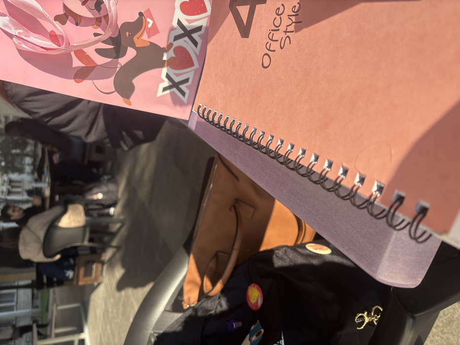 The image captures a sunlit outdoor cafe patio in an urban environment, consistent with a setting in Plovdiv, Bulgaria. In the immediate foreground, a pink spiral-bound notebook with "Office Style" and a partial "4" on its cover is positioned on a flat surface, with sunlight casting a distinct shadow across it. Adjacent to the notebook, on the right, stands a pink gift bag adorned with a cartoon dachshund holding a heart, accompanied by "XOX" text and multiple hearts, featuring pink ribbon handles. To the left of these items, a black bag, possibly a backpack, is visible, decorated with several pins, including a yellow circular one and a purple one. Below and slightly behind the black bag, a tan or light brown leather-like handbag rests. These items are situated next to a black armrest or similar dark surface. In the blurred background, several individuals are seated at dark tables with black chairs on a paved patio. One person is observed from behind, wearing a light-colored, possibly beige or tan, jacket. Another individual with dark hair is partially visible to their left, facing away from the camera. The scene is illuminated by strong sunlight, creating long shadows across the paved ground, indicative of a daytime setting. Buildings with light-colored walls are discernible in the distant background.