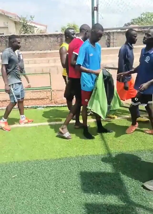 Several men are gathered on a green artificial turf field enclosed by a chain-link fence. The men are wearing athletic clothing and appear to be discussing something. One of the men in a blue shirt is holding a green and black garment. Another man walks by wearing a gray jacket with the word "Football" on the back. In the background, there is a low concrete building and some trees.