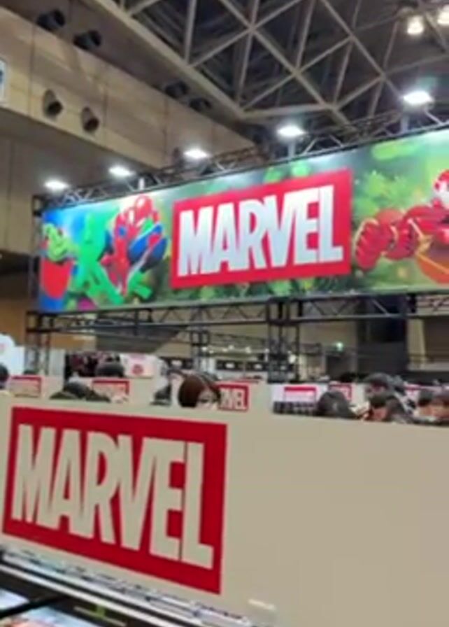 n indoor trade fair booth with a large Marvel logo on the front. Above the booths are large screens advertising Marvel on the left and Star Wars on the right. Several people, some wearing masks, are visible in the background.