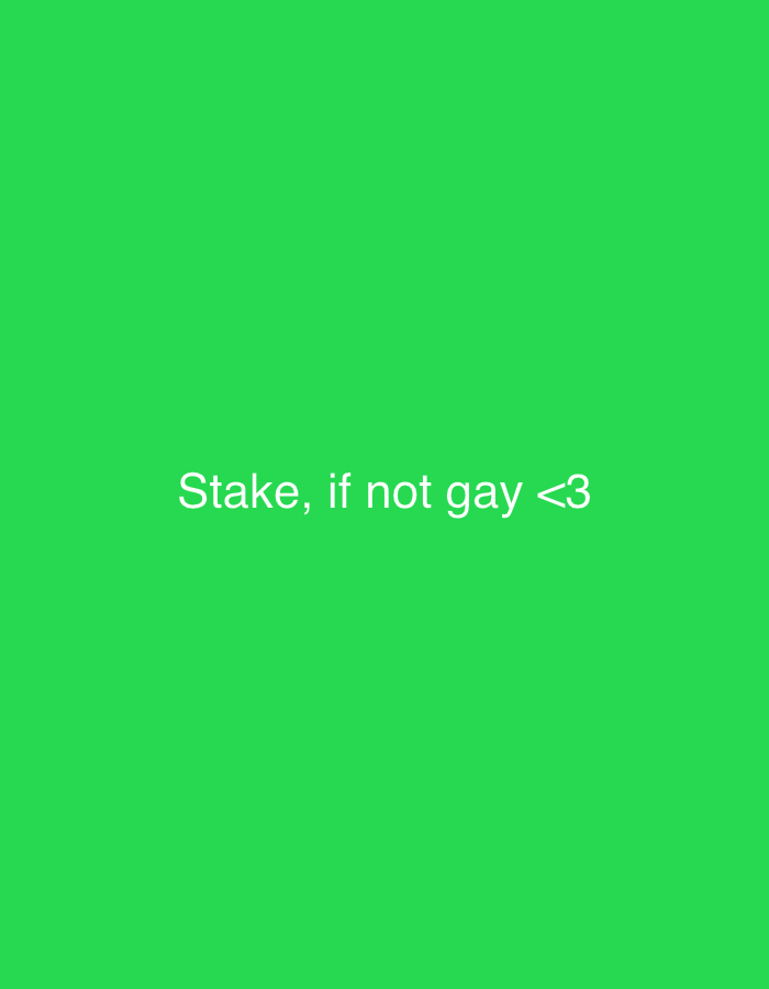 The image displays a solid, bright green background. Centered horizontally and vertically on this background is white text that reads: "Stake, if not gay <3". There are no other discernible subjects, objects, people, actions, interactions, or environmental elements present within the image. No specific location within the city of Sofia, Bulgaria, or any other geographical area, is depicted or implied by the visual content.